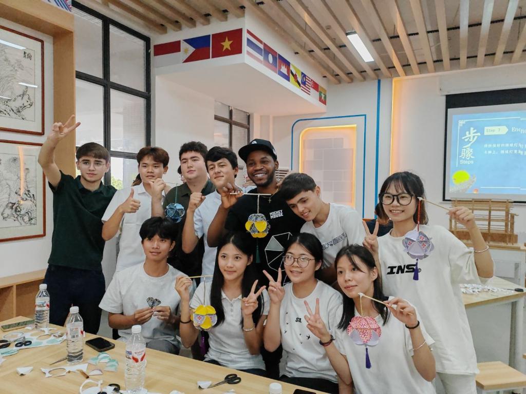 活动伊始,中外学生混合分组,在轻松愉快的氛围中迅速破冰。从共同参观文创坊与数字孪生工程中心,到合作完成侗族传统建筑模型的拼搭比赛,再到一起动手制作中秋绣球灯笼,大家在协作中增进理解,在互动中建立友谊。从一开始的略微害羞,到大声宣布这是我的朋友,文化交流的种子已经悄然发芽。当中外青年举着绣球灯笼用汉语说出“中秋快乐”的那一刻,灿烂的笑容诠释了“天涯共此时”的美好意境。