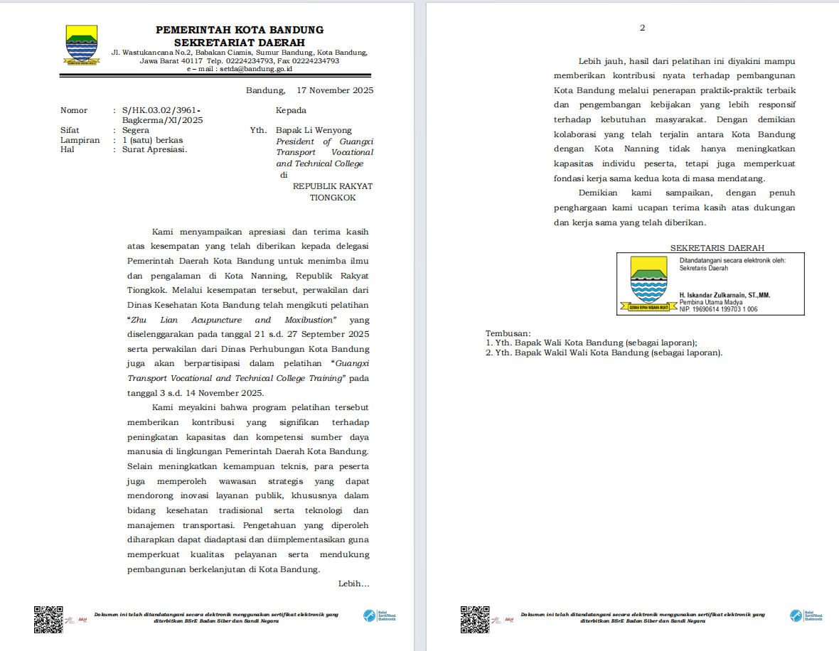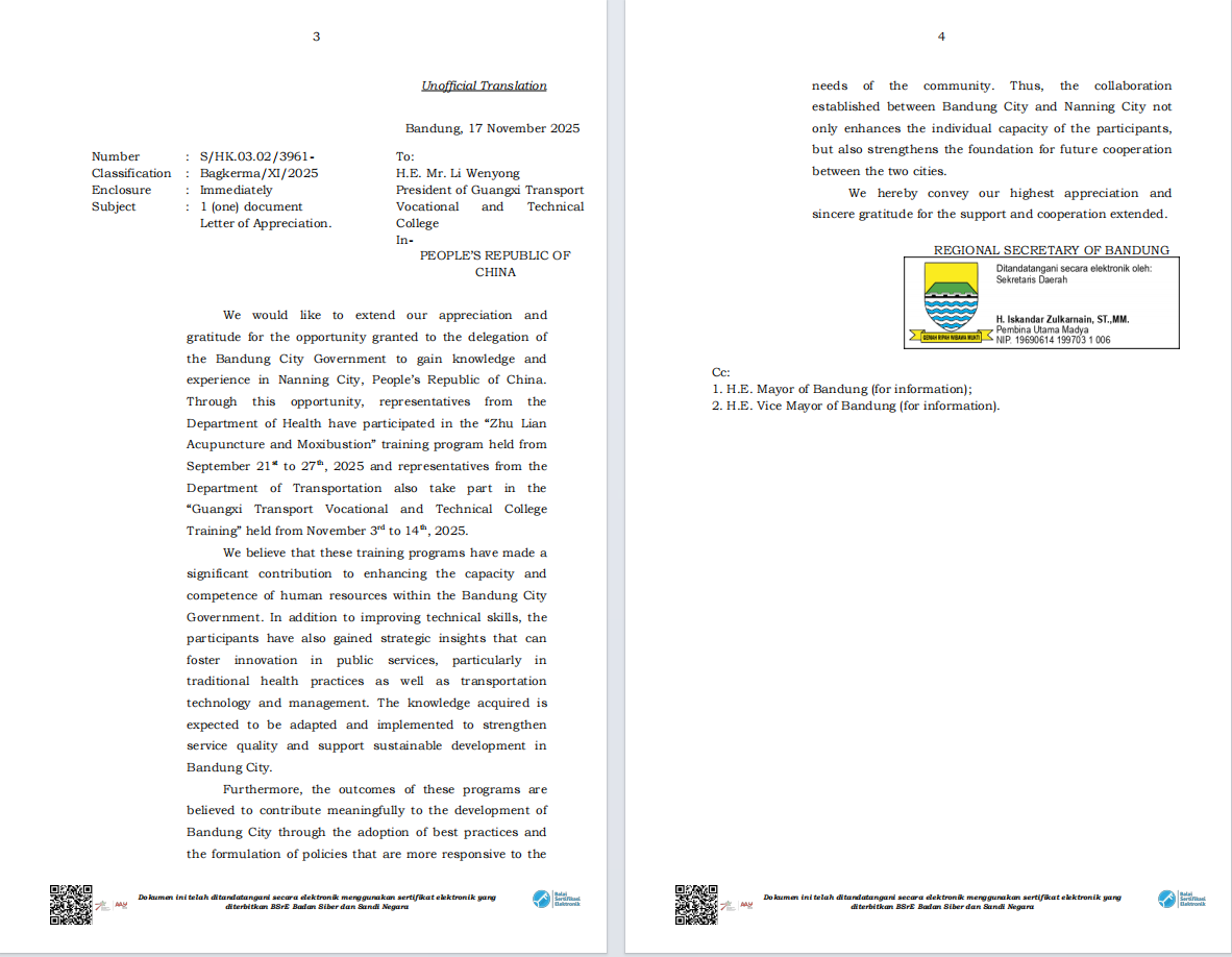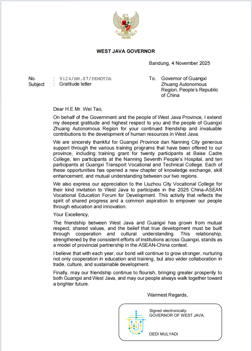近日,西爪哇省政府致函广西壮族自治区主席韦韬和我校校长李文勇,对广西壮族自治区政府组织的各类培训项目和我校组织开展的交通技术培训项目表示感谢。西爪哇省政府在感谢信中提到,交通技术培训项目为提升西爪哇省政府工作人员的交通技术水平作出了重要贡献,不仅提升了学员新能源汽车与智慧交通领域的技术能力,还为两地建立了更为紧密的合作关系,为未来的进一步合作奠定了基础。