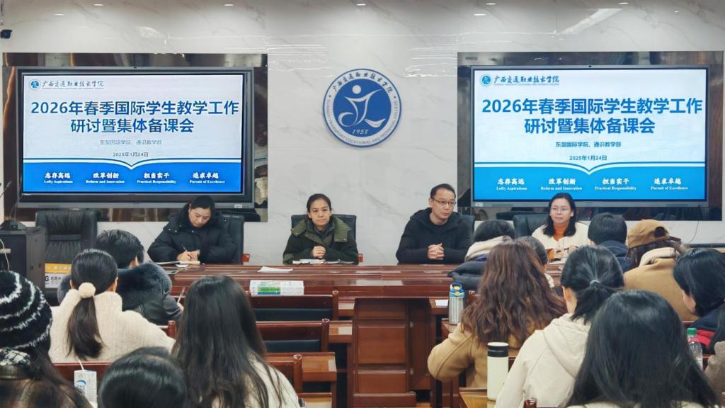 1月24日,东盟国际学院与通识教学部联合召开2026年春季国际学生教学工作研讨会暨集体备课会,30余名专任教师、教学管理人员、国际学生管理人员参加会议,东盟国际学院负责人杨红成、通识教学部主任梁东颖、通识教学部副主任陆肖乐出席会议,东盟国际学院副院长严丽主持会议。