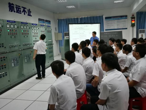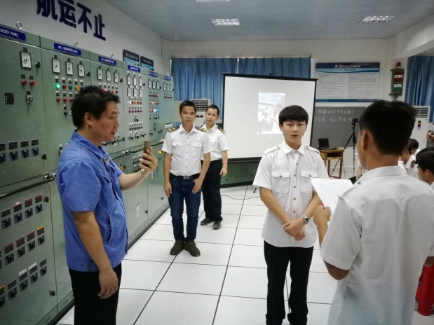 课堂上,黄兆牛老师首先针对轮机工程技术专业轮机管理岗位对船舶电站操作的要求,从船舶电站的主要知识点讲授入手,让学生理解船舶电站的工作原理、发电机的并电和解列的条件以及注意事项等基本知识,以“任务驱动”等教学方法,采用工作页与分组操作相结合的方式开展教学。接着,在实际操作环节由甘凌斌老师在船舶电站演示发电机的手动并电和解列,黄兆牛老师在一旁同步讲解和提醒学生注意观察。最后,学生分组测试,各组现场设计两台发电机并电及解列的步骤,并进行“发令—传令—执行”等角色模拟,提高课堂效率,加深学生体验,使同学们在实操中领悟理论知识,并反思自己的实际操作行为。操作中老师通过手机同屏直播,对各个角色的“表演”给予及时精准的评价,对失误进行启发式总结。同学们对课程的内容和形式都表现出浓厚的兴趣,课堂表现积极活跃,收到了很好的教学效果。