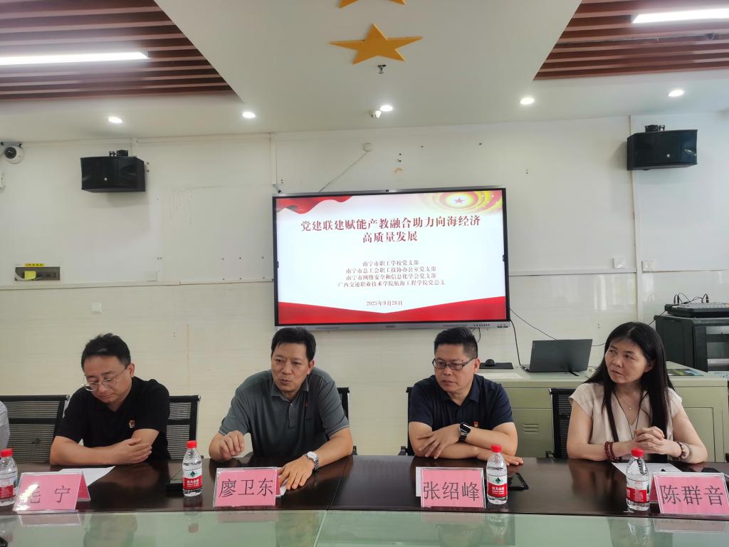 (航海工程学院 讯 王虎平/文)9月26日下午,航海工程学院党总支与到访的南宁市职工学校党支部、南宁市总工会职工技协办公室党支部、南宁市网络安全和信息化学会党支部在广西交通职业技术学院相思湖校区实训楼 604 会议室开展“党建联建赋能产教融合助力向海经济高质量发展” 为主题的交流会。南宁市职工学校党支部书记廖卫东,南宁市总工会职工技协办公室党支部书记、主任张绍峰,南宁市网络安全和信息化学会党支部书记、副会长兼秘书长毛宁等领导同志带队出席,学院党总支书记黄庆华、副书记黄月芬及各党支部委员一同参会,共探党建共建与产教融合新路径。本次会议由学院党总支书记黄庆华主持。