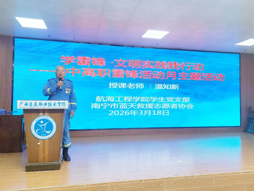 3月18日下午,广西交通职业技术学院相思湖校区实训楼402报告厅内温情涌动。一场以“学雷锋文明,践行我行动”为主题的志愿服务宣讲会在此举行,主讲人温知新老师站在讲台前,目光深情地环顾四周——62年前,他是这里(原广西交通学校)1963级轮机修理与制造专业的学生;62年后,他以南宁市蓝天救援志愿者协会培训部副部长、广西泳协防溺水资深宣讲师的身份回到母校,向“学弟学妹”们讲述那些关于守护与奉献的温暖故事。
