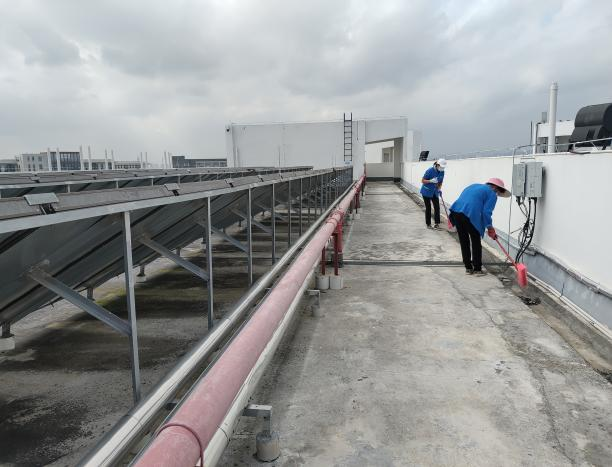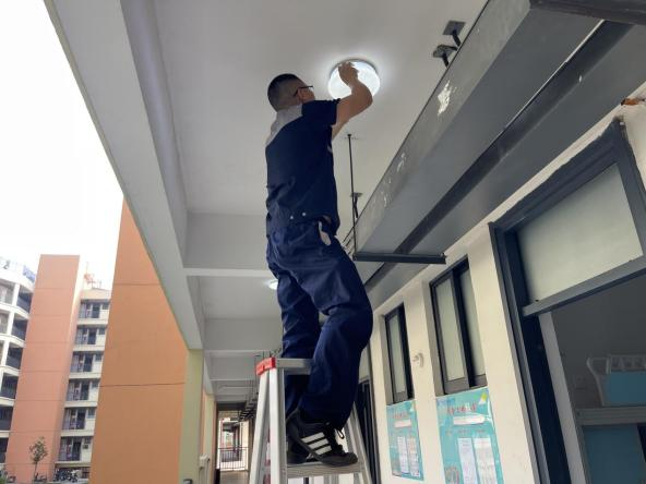 为确保师生员工返校后能正常使用设施设备,维修人员全面巡查校园产权高压供电线路,重点对侵入供电线路安全距离内的树木、杂草、违建临时设施等进行检查及处理,确保高压线路走廊安全;对变压器至各建筑楼层总配电箱的巡查和维护,重点检查各类开关及保护装置的可靠性,对接触不可靠、反应不灵敏、积尘等安全隐患进行排查和处理,保障各区域用电安全;对应急发电设备进行维护、保养及试运行,提前储备发电用油,保障突发停电时重点区域的应急用电;对校园公共区域高杆路灯、庭院灯、走廊灯、卫生间照明进行检;校内二次供水系统进行清洗、消杀、水质采样送检;对直饮水设备设施清洁、消毒、维护;对宿舍热水供应设施设备进行全面检查、维护;对宿舍区域所有设备设施进行维护检修;对校园所有建筑化粪池进行清理、抽渣;完成校园学生公寓防雷装置安全隐患整改及复检(复检合格);全面检修消防应急灯和指示牌,完成全校电梯的保养工作;确保整个学校设施设备的正常运转。