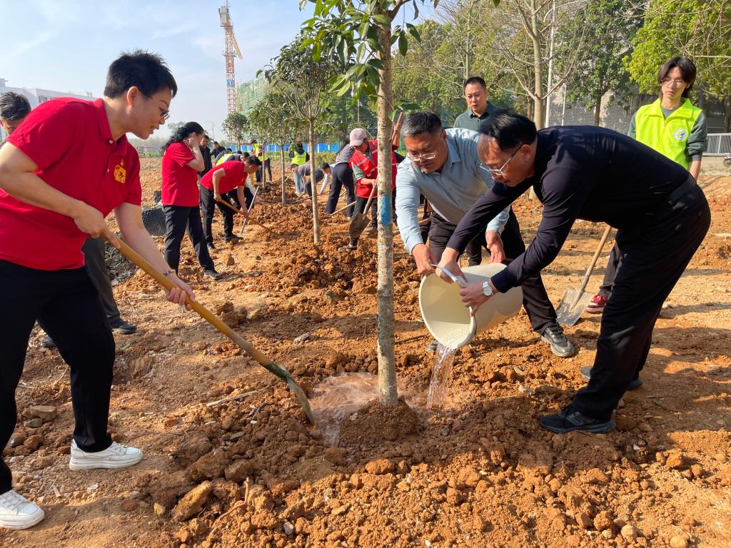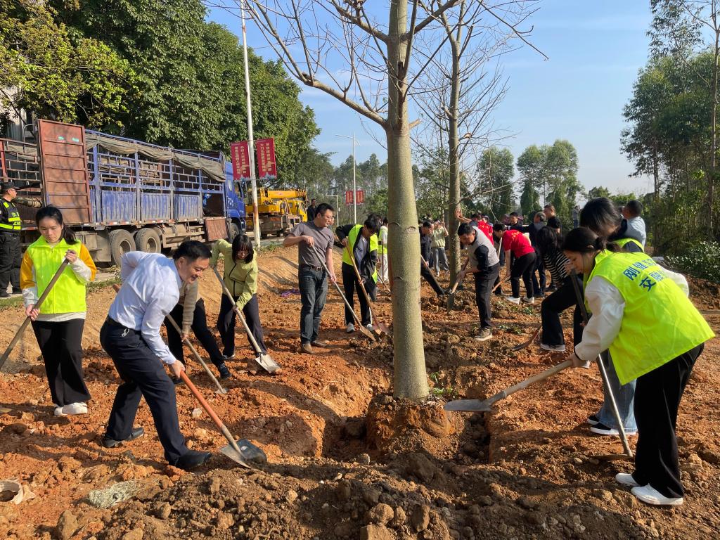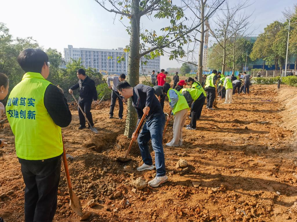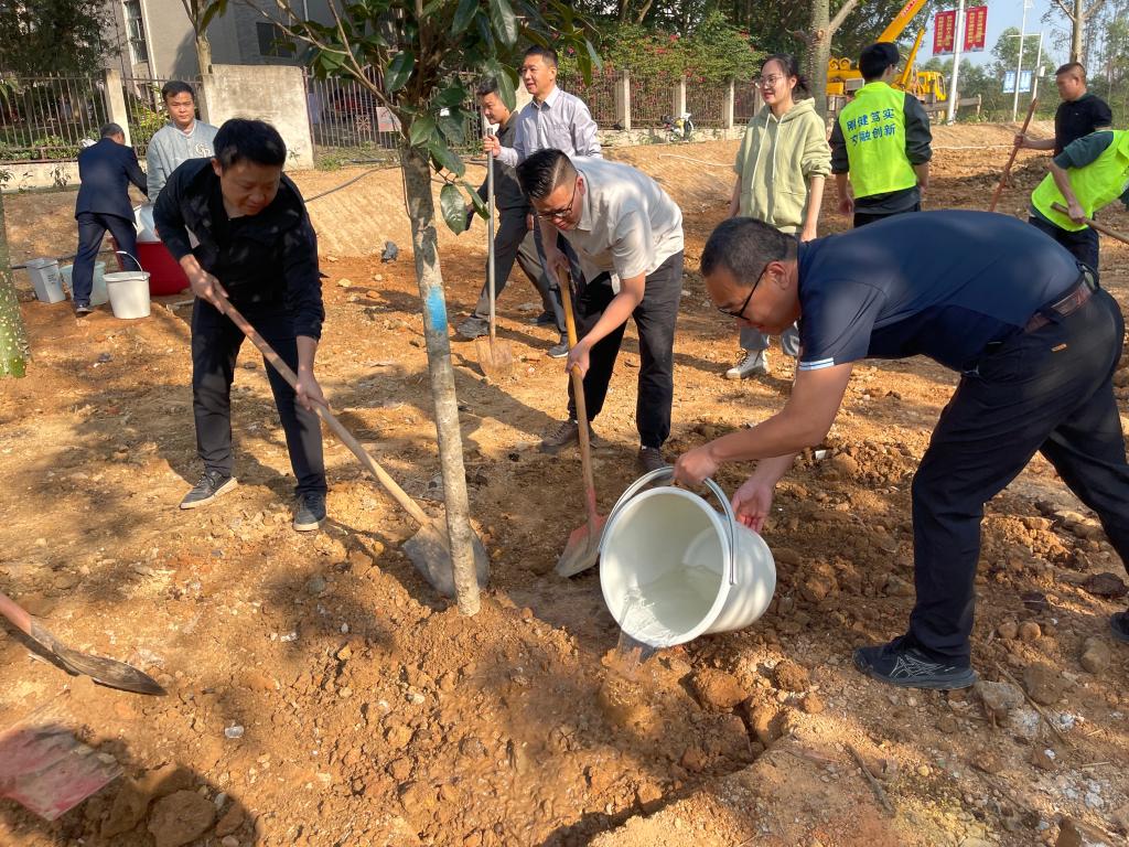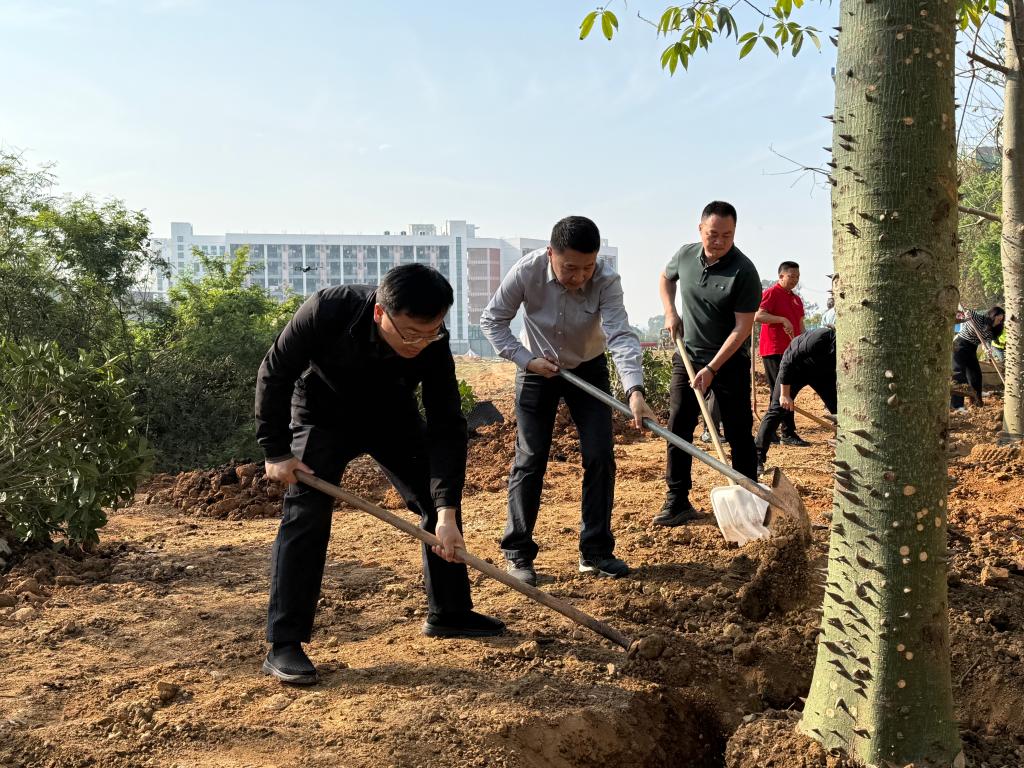 植树现场热火朝天,校领导与师生们三五成组、分工协作,大家挽起衣袖、拿起工具,默契配合完成铲土挖坑、扶苗正树、培土压实、浇水定根每一道工序,各个环节衔接有序、一丝不苟。经过一个多小时的辛勤劳作,8株挺拔的木棉树、20株芬芳的桂花树错落有致地“安家落户”,在和煦春风中舒展身姿,为春日校园增添了一抹鲜亮的绿色,呈现出勃勃生机。
