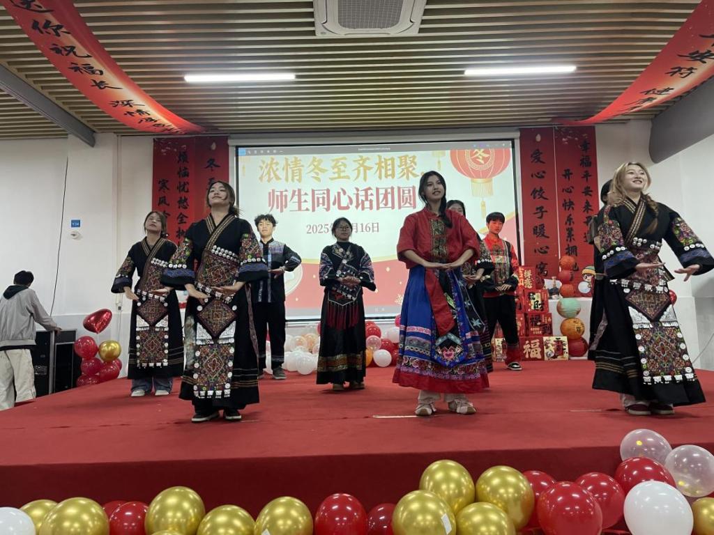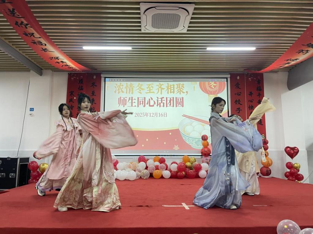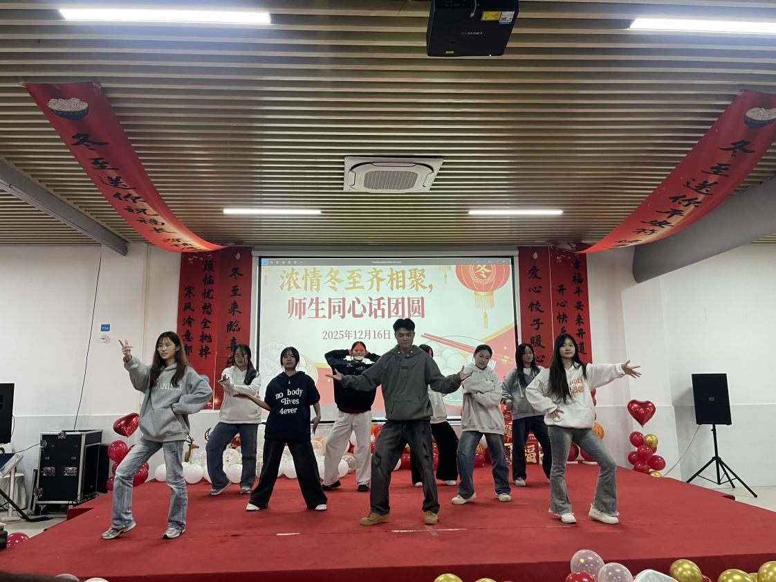 为进一步烘托热烈互动的氛围,活动精心设置了多元特色环节,包括“‘饺’了个创意 —— 包饺子挑战赛”趣味竞技、舞蹈表演展风采及冬至知识竞赛抢答等。趣味竞技现场,同学们各显身手,围绕包制速度与创意巧思展开比拼,欢声笑语此起彼伏、热闹非凡;舞蹈表演环节,同学们献上活力满满的节目,灵动的舞姿、饱满的热情,为活动注入了浓厚的文化艺术气息;知识抢答环节中,大家踊跃举手、争相作答,在轻松愉悦的氛围中深入了解冬至的由来、习俗及文化内涵,有效深化了传统文化传承实效。