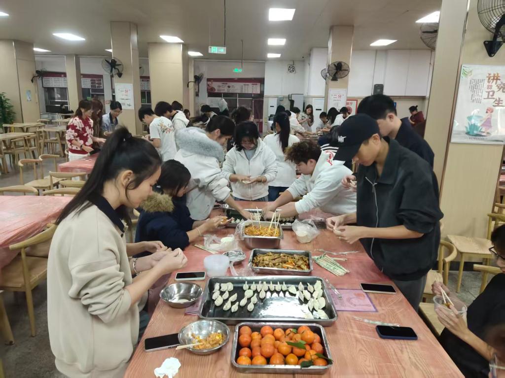 活动在戴晓云副校长的殷切寄语与现场师生的热烈掌声中正式拉开序幕。同学们自发组队、分工协作、默契配合,有条不紊地投入到饺子包制中:动作娴熟者行云流水,捏褶、塑形一气呵成;初学尝试者认真摸索,在食堂工作人员与教师的耐心指导下,很快掌握了填馅、捏合的要领。一个个形态各异、创意十足的饺子迅速摆满托盘,有的圆润饱满、有的造型别致,既藏着动手实践的乐趣,更透着青春学子的鲜活活力,欢声笑语始终萦绕在食堂上空。
