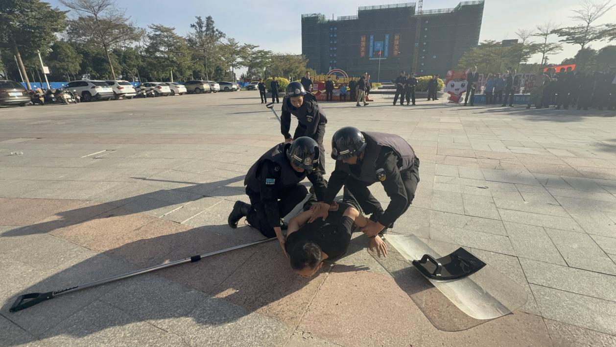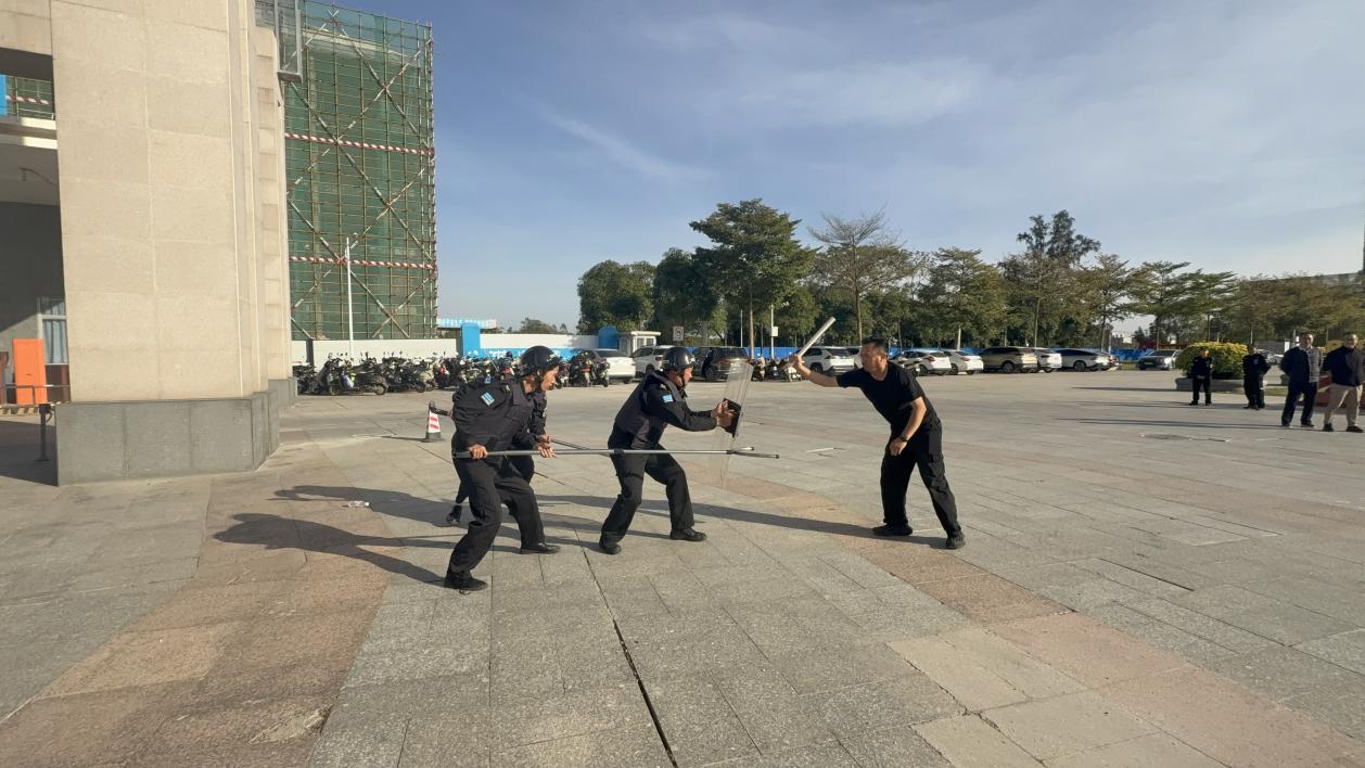三塘派出所民警现场讲解盾牌、防暴钢叉、橡胶棍等器械的使用方法、攻防技巧及注意事项。模拟实战环节中,应急防暴组、疏散组在民警指导下各司其职、协同配合,攻防动作规范实用,处置高效,充分展现了校园安保队伍的专业素养。