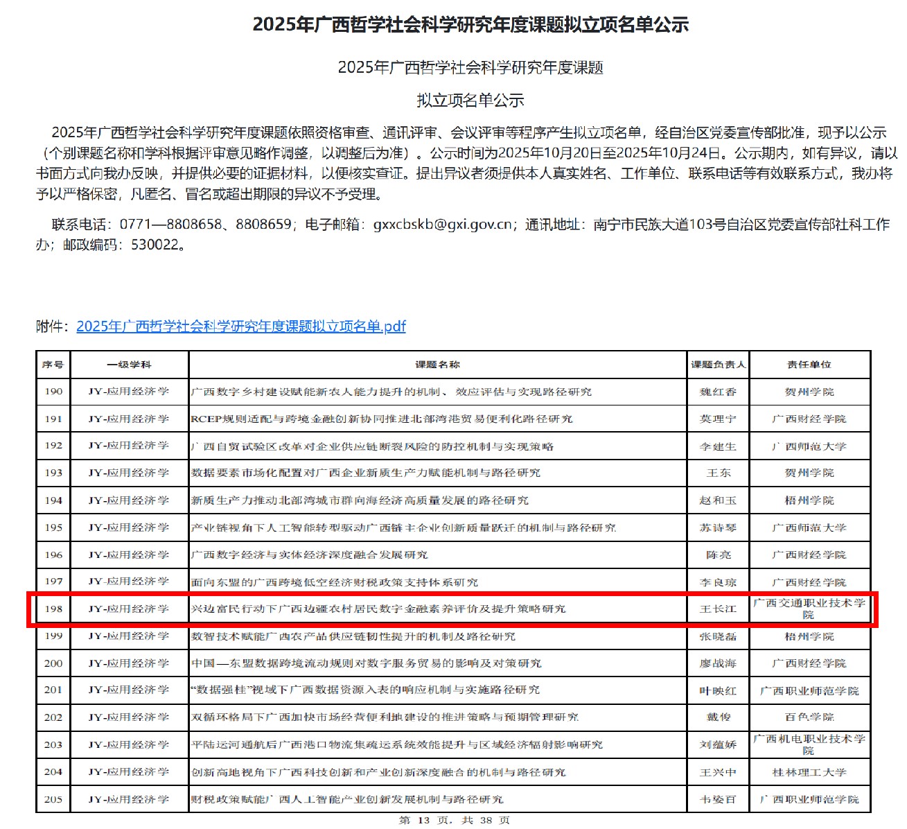1020日,广西壮族自治区哲学社会科学工作办公室公示了2025年广西哲学社会科学研究年度课题拟立项名单,名单显示我校王长江老师的项目入选。