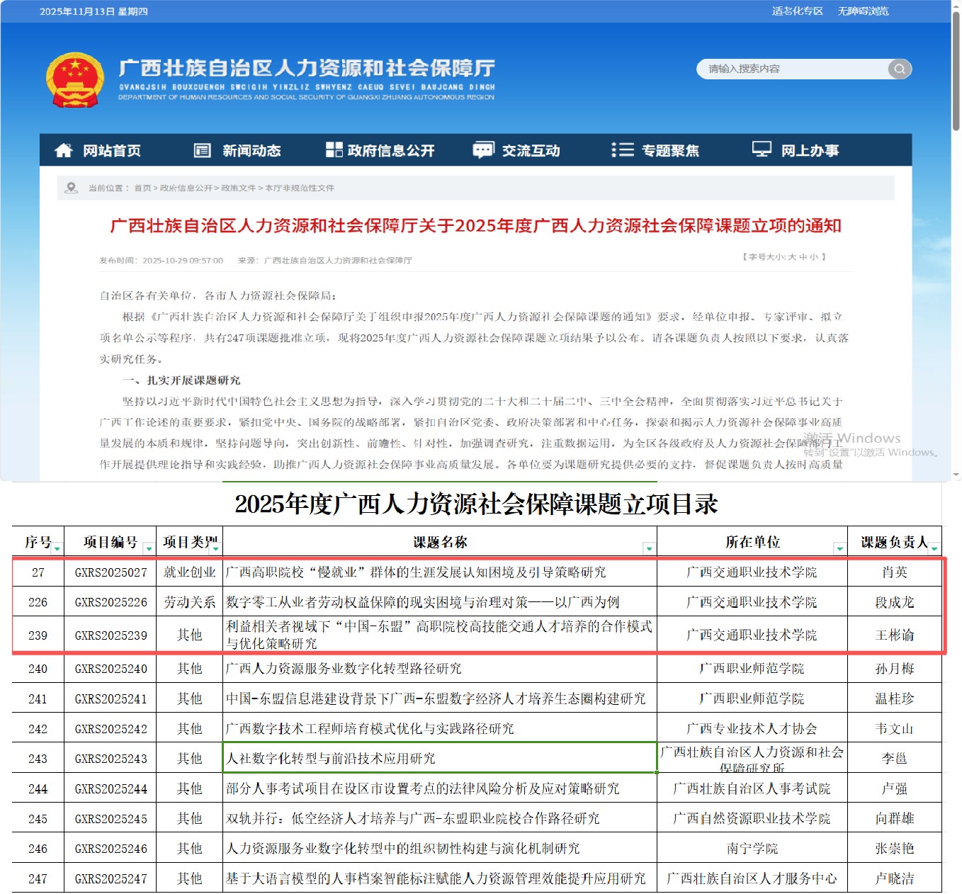 1029日,自治区人力资源和社会保障厅公布了2025年度广西人力资源社会保障课题立项目录,我校肖英、段成龙及王彬渝老师的课题获得立项,涵盖就业创业、劳动关系等领域,体现了学校在服务区域人社发展与职业教育研究方面的积极探索。