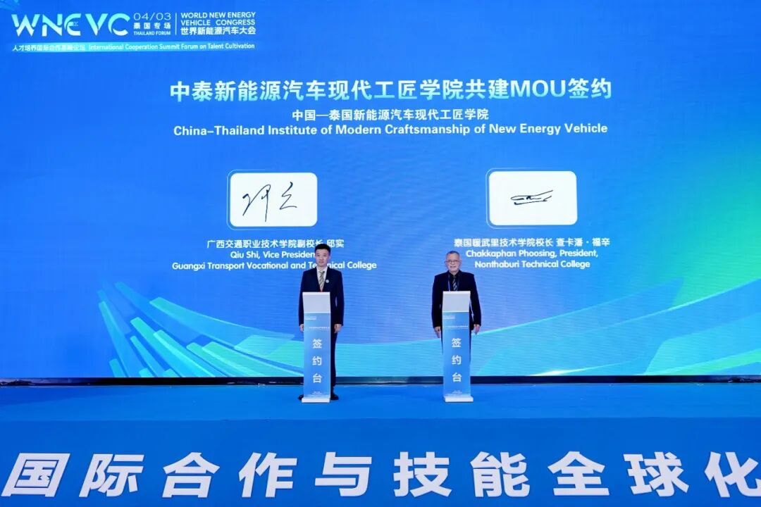 (东盟国际学院 讯 严丽、陈芳兰/文)在2026世界新能源汽车大会(泰国专场)暨人才培养国际合作高峰论坛上,我校副校长邱实以《擎动广西制造 智链东盟产业——跨境新能源汽车专业集群建设改革与实践》为题,立足产业、聚焦跨境、紧扣合作作主题发言,向来自各国家(地区)嘉宾介绍学校在新能源汽车技术专业群建设、产教融合模式创新、国际标准输出等方面的“双高”建设成果,赢得中外嘉宾广泛赞誉。此外,学校与泰国高校签署合作备忘录,共建新能源汽车工匠学院。