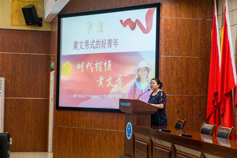 此次主题团日活动中,校团委临时负责人朗诵诗歌《中国人,不跪的人》, 思想政治理论课教学部王朵老师主讲微团课《争做黄文秀式的好青年》。