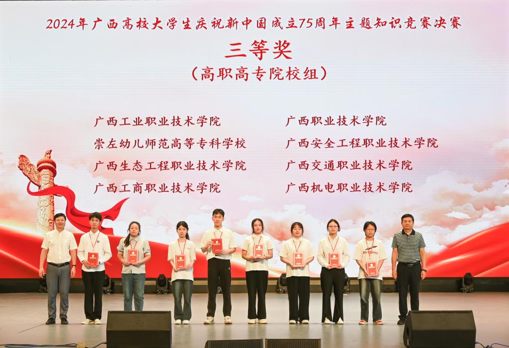 决赛按照高职高专组和本科院校组分别进行,比赛现场气氛紧张又热烈。来自全区的24所高校代表队共72名参赛选手展现了扎实的党史、国史等知识储备。决赛中,我校代表队团结协作、不畏强手,经过必答题、抢答题、风险题三个环节的激烈比拼,最终获得了高职高专组三等奖的好成绩,充分展现了我校学子团结奋进,奋勇争先的良好精神风貌。