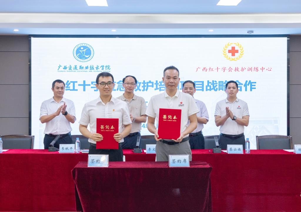 学校团委负责人林波与广西红十字会救护训练中心负责人周兆元进行红十字应急救护培训项目战略合作签约。