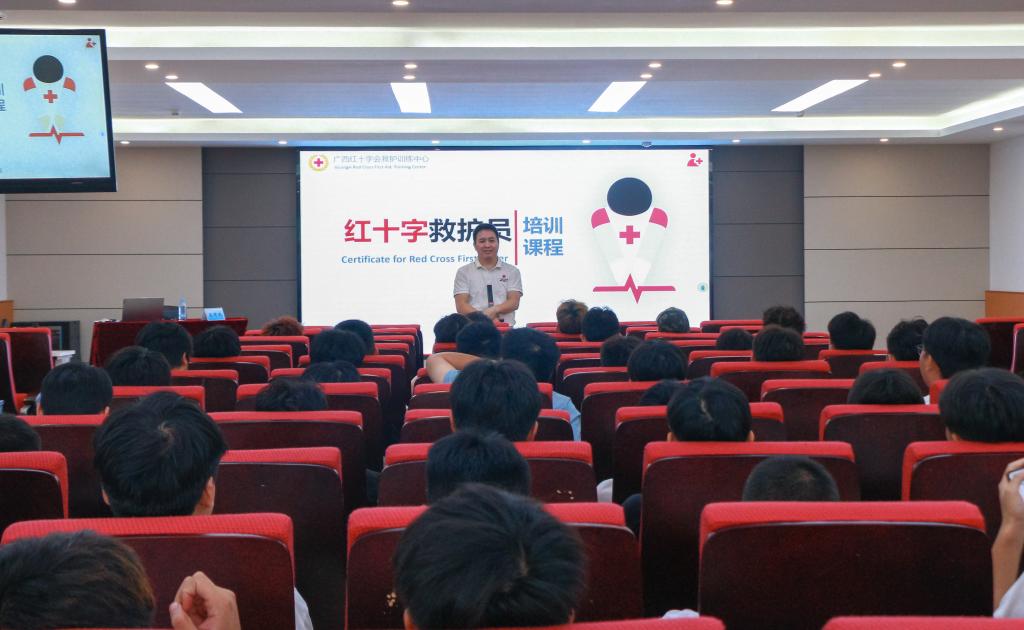 学校校长李文勇与广西红十字会救助救护部部长蔡云旗为学校“开路先锋十百千”交通安全志愿服务教育培训示范基地”揭牌。揭牌仪式后,广西红十字会救护训练中心的老师们通过“理论+实操”相结合的方式,进行交通应急处置志愿服务专题讲座。