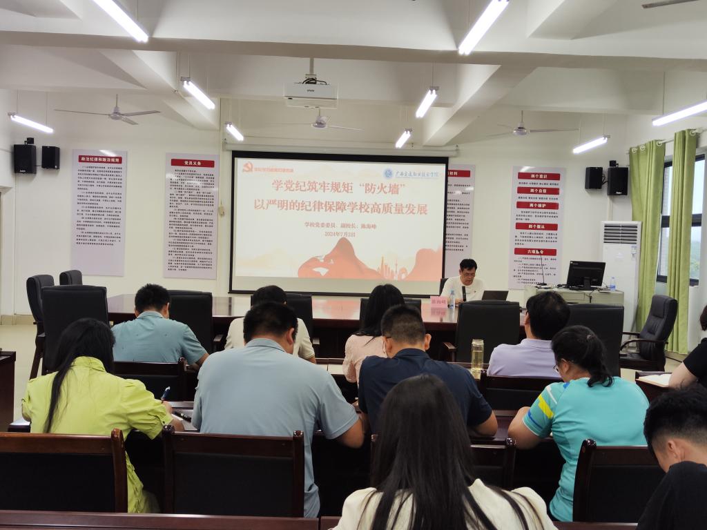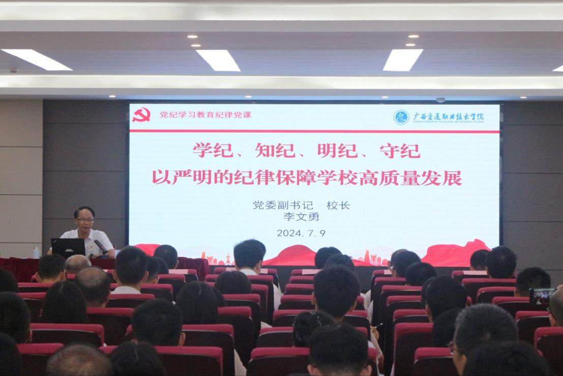 学校党委副书记、校长李文勇以《学纪、知纪、明纪、守纪——以严明的纪律保障学校高质量发展》为题,在路桥大楼会议室讲授党纪学习教育纪律党课。李文勇校长从学纪、知纪、明纪、守纪四个方面出发,阐述了党纪学习教育的重大意义;全面解读了新修订的《中国共产党纪律处分条例》;通过鲜活的案例,教育引导全体党员教师严格对照《条例》查摆自身存在的问题,廉洁守律、拒腐防变,号召全体党员拧成一股绳、聚成一股力推动学校高质量发展。