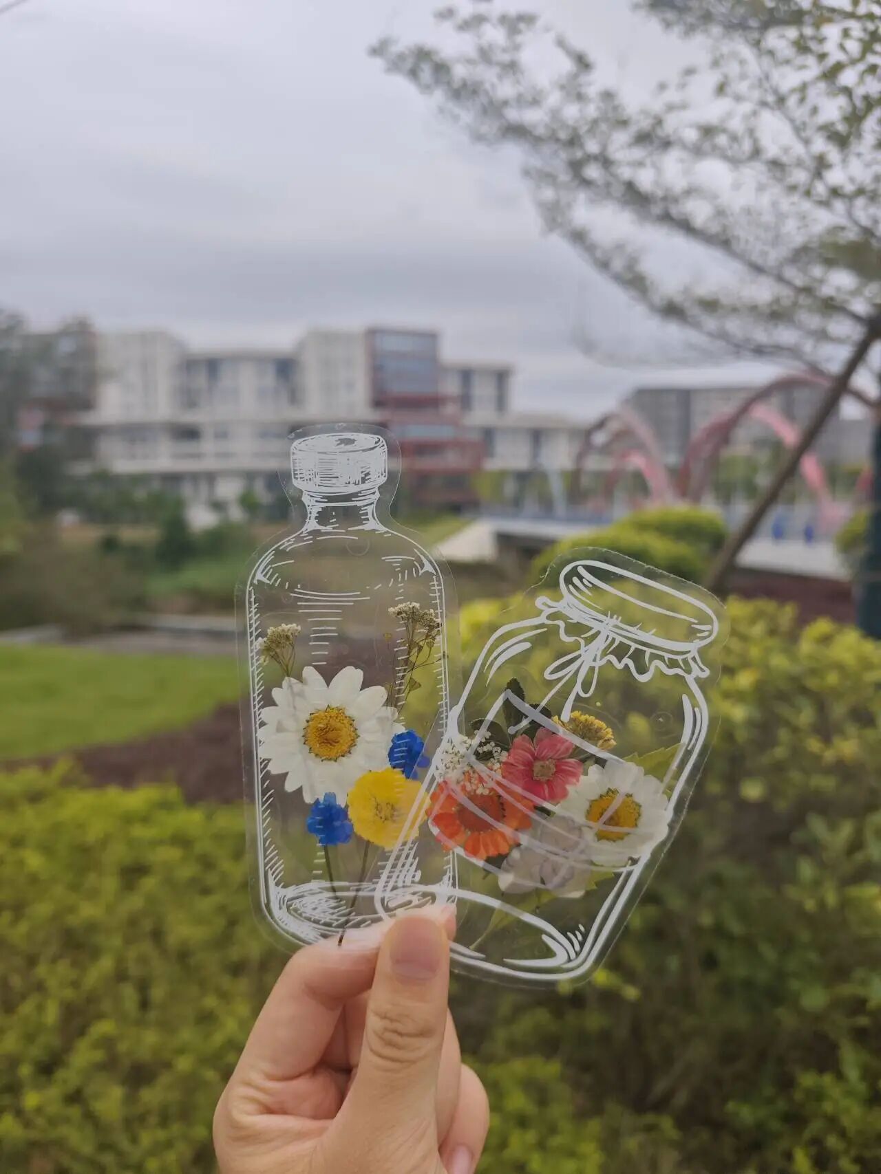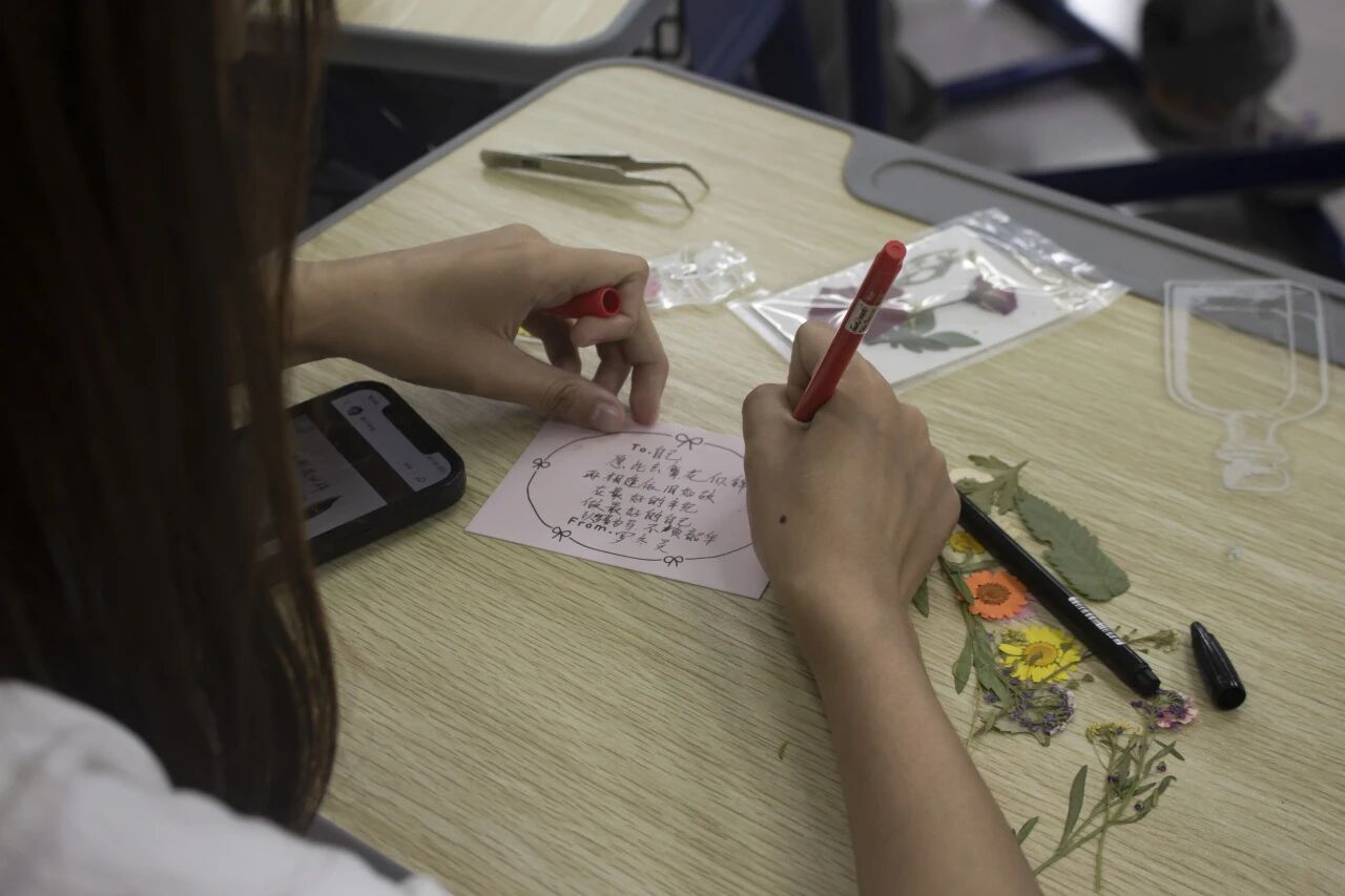 专注手作,情绪流动。制作环节中,同学们以4-5人为一组协同创作,大家精心挑选花材、细心布局构图。镊子轻夹,流苏垂落,原本零散的花叶在透明书签中定格成画。过程中,组员间自然交流选花原因、分享想探索的校园角落,陌生感在协作中悄然消融。