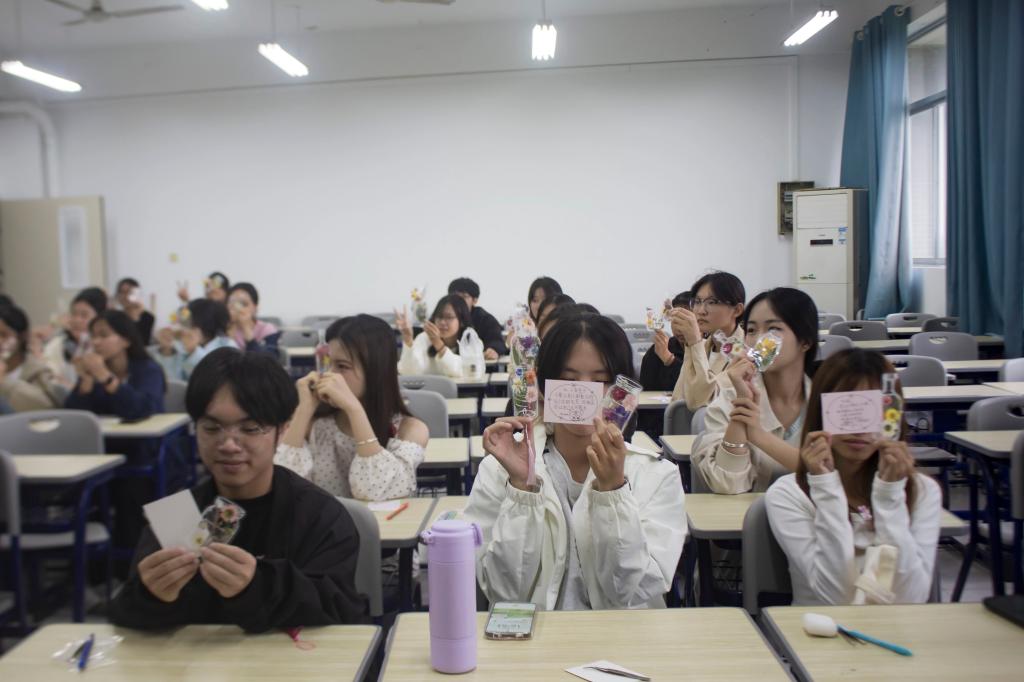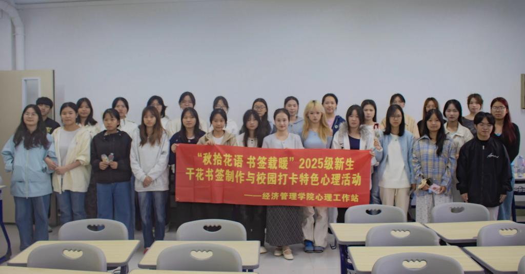 人力2025-1王同学说:“今天特别感谢学院组织的‘秋拾花语’活动!破冰时的轻松互动、制作书签时的专注协作,让我很快和新同学熟络起来。选花、搭配的过程特别治愈,听着工作人员讲干花寓意和心理小知识,入学的焦虑慢慢消散了。拿着亲手做的书签和大家合影,真切感受到了校园的温暖,也更期待接下来的大学生活了!”