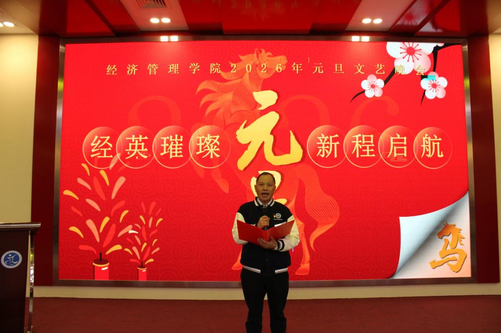 12月30日晚,经济管理学院“经英璀璨·新程启航”2026元旦文艺晚会在昆仑校区综合楼C2报告厅圆满落下帷幕。学校学生工作处副处长温干祥、学校团委社团管理科科长胡兰蕊、经济管理学院党总支书记张小健、副院长马赛、党总支副书记孙坚与师生代表欢聚一堂,以歌舞、朗诵、小品等多元形式辞旧迎新,在青春律动中凝聚经英力量,于温情展演里共赴新程。
