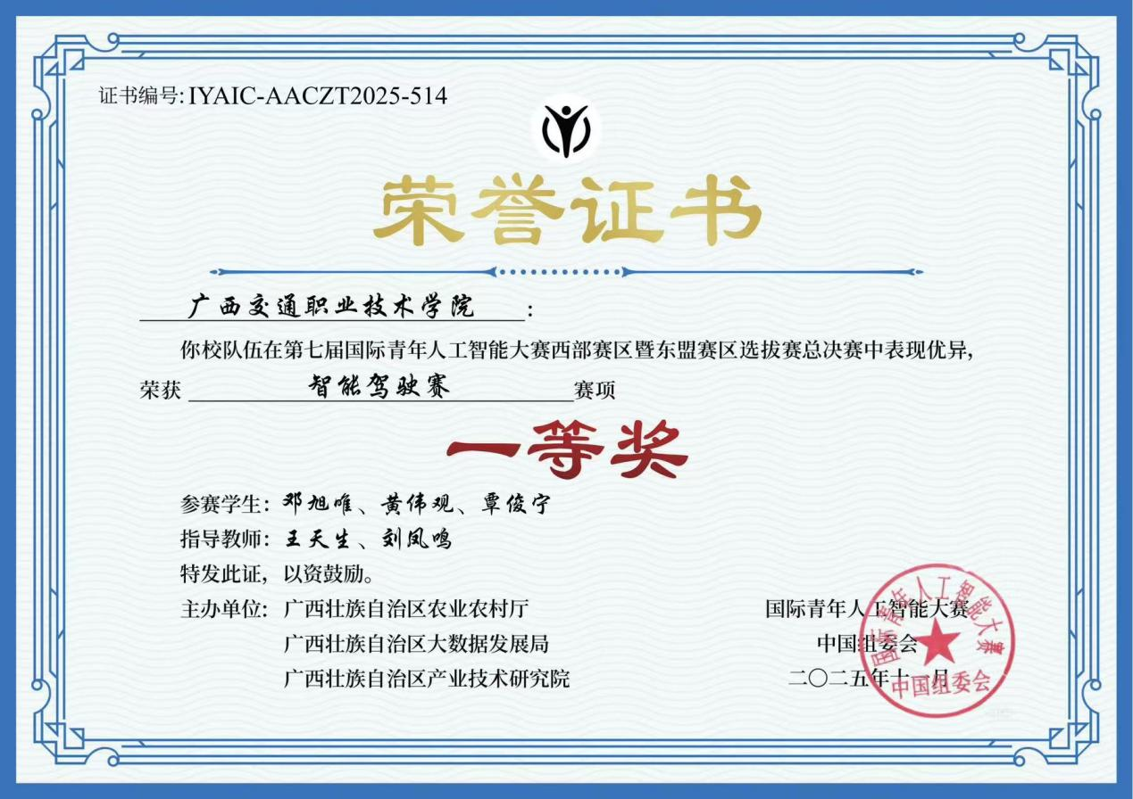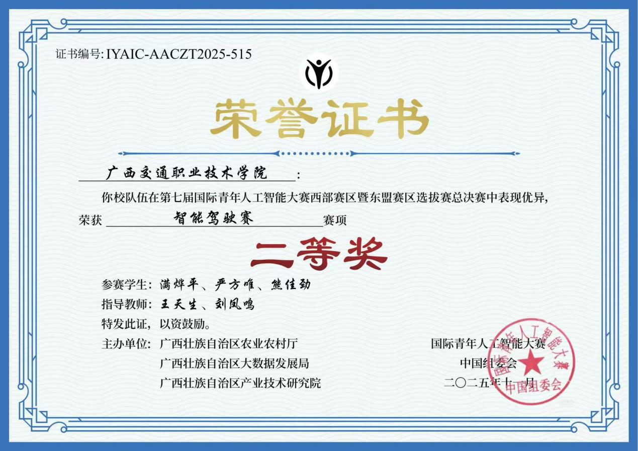 比赛设置主赛道、西部赛区暨东盟赛区专项赛以及赛区特色赛三大类赛项,涵盖智能驾驶、智慧船舶、人形机器人挑战、中国—东盟农业人工智能创新等多个前沿领域。我院学生参赛代表队在竞争激烈的智能驾驶赛项中表现突出,斩获佳绩,展现我院学子出色的创新能力和扎实的专业技能。