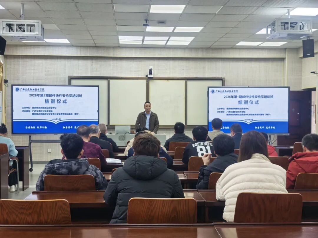 1月11日至16日,由国家邮政局邮政业安全中心主办、广西交通职业技术学院交通运输学院承办的2026年第一期邮件快件安检员培训班在南宁圆满落幕。来自中国邮政、韵达快递、申通速递等企业共31名参训学员,经过线上+线下培训,顺利完成全部学习任务并通过考核。