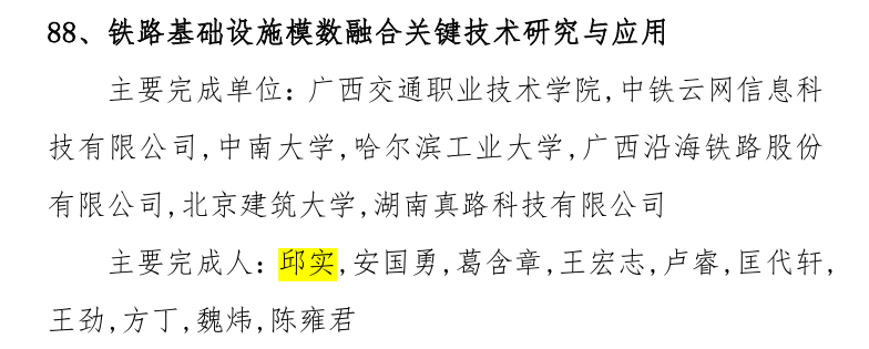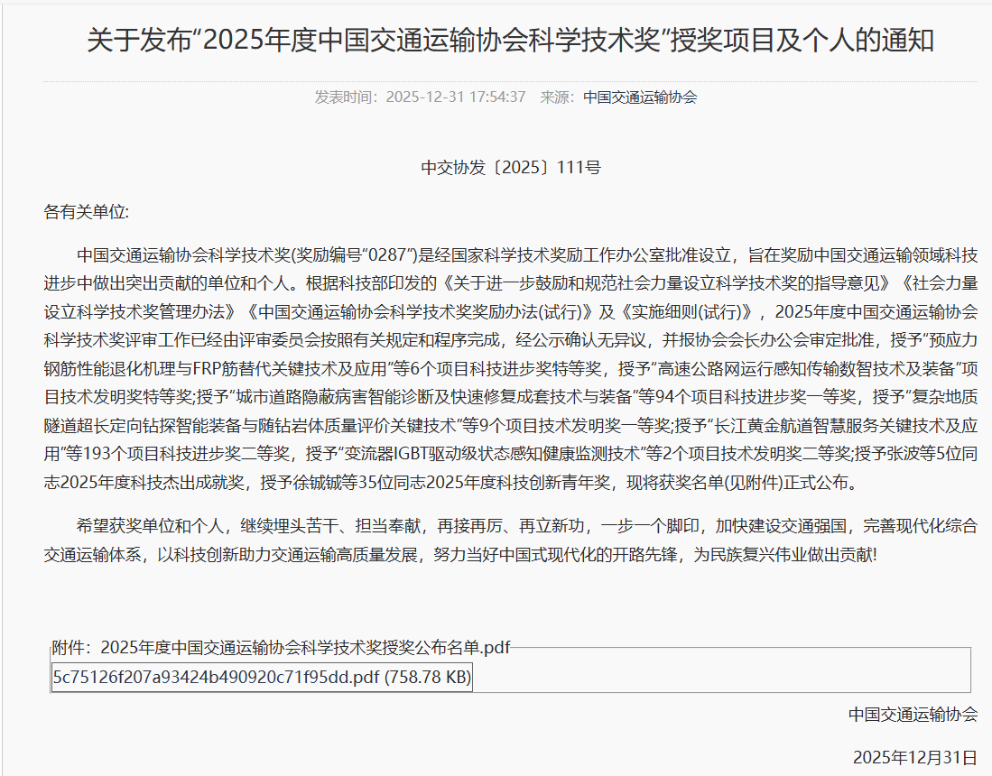 12月31日,中国交通运输协会公布2025年度科学技术奖名单,我校牵头完成的《铁路基础设施模数融合关键技术研究与应用》项目获科技进步奖二等奖。这是学校首次牵头斩获该项殊荣,未来我校将持续以科技创新助力广西交通运输高质量发展。