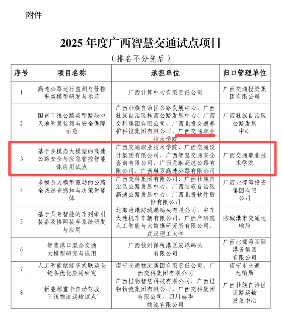 近日,自治区交通运输厅公布了2025年度广西绿色交通试点项目和广西智慧交通试点项目名单。经申报推荐、形式初审、答辩评审、综合审议和公示等程序,共确定8个项目为2025年度广西智慧交通试点项目。其中我校牵头申报的《基于多模态大模型的高速公路安全与应急管控智能体应用试点》及以联合单位申报的《国省干线公路典型路段空天地智慧监测与安全保障示范》成功入选,学校将继续以试点项目为抓手,为行业数字化与人工智能的进一步发展和应用提供强劲动力。