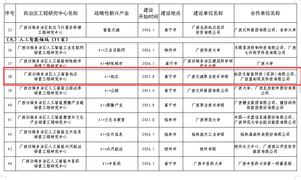 12月19日,广西壮族自治区发展和改革委员会印发通知公布2025年度广西工程研究中心认定名单,我校牵头申报的“广西壮族自治区人工智能低空场景工程研究中心”成功获批。这是我校第三个区级工程研究中心,标志着学校高水平科研创新平台建设再获重要突破。