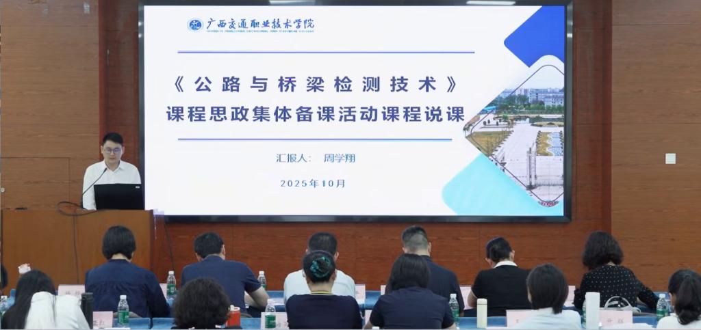 (路桥讯)2025年10月15日,由全国交通运输职业教育教学指导委员会主办的2025年职业教育交通运输大类(陆上专业)课程思政集体备课活动在四川交通职业技术学院举行。我院教师周学翔作为国家级精品在线课程《公路与桥梁检测技术》教学团队代表,就该课程进行说课与教学展示,获得与会专家一致好评。