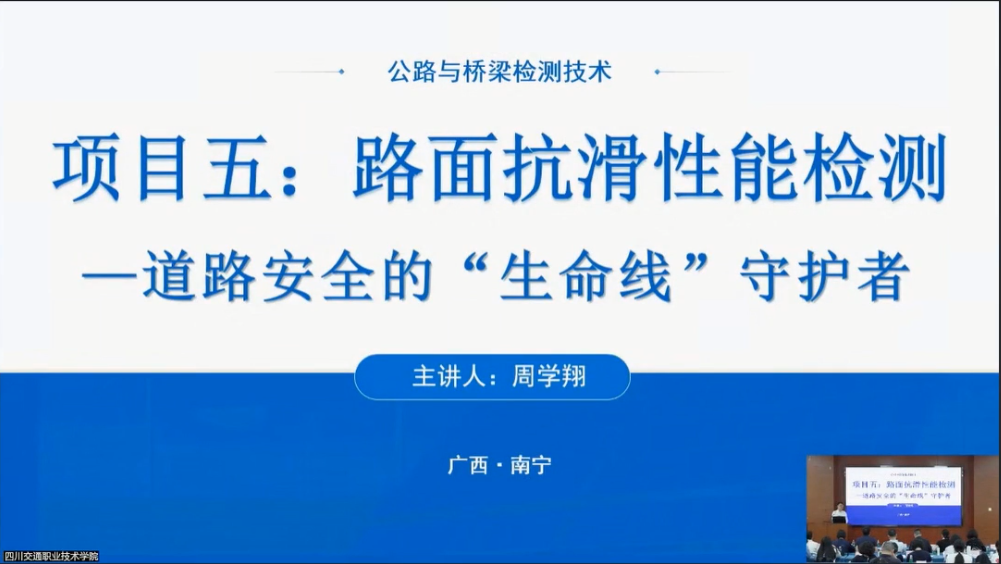 在教学展示环节,周学翔老师以“道路的抗滑性能检测”为具体案例,生动呈现了如何将家国情怀、大国工匠精神和职业道德规范等思政要素,自然融入课程讲解与技能训练的全过程,直观展现了课程团队在课程思政建设方面的创新探索与实践成效。