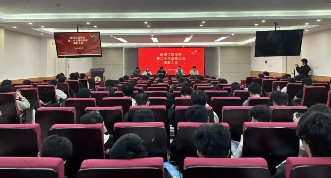 (路桥讯)在学校第二十三届田径运动会上,路桥健儿奋勇争先,一举斩获7枚金牌,同时拿下男子团体总分季军、女子团体总分季军,以优异成绩荣获年度团体总分第三名,为学院赢得了荣誉。近日,学院第二十三届校运会运动员表彰大会在路桥楼615报告厅举行。学院学工办主任刘鹏飞老师、全体辅导员以及参赛运动员齐聚一堂,共同分享这份拼搏而来的喜悦。报告厅里,红彤彤的荣誉证书格外醒目,和运动员们胸前的校徽相互映衬,这既是赛场上汗水与拼搏的见证,更彰显着路桥人“逢山开路,遇水架桥”的精神。