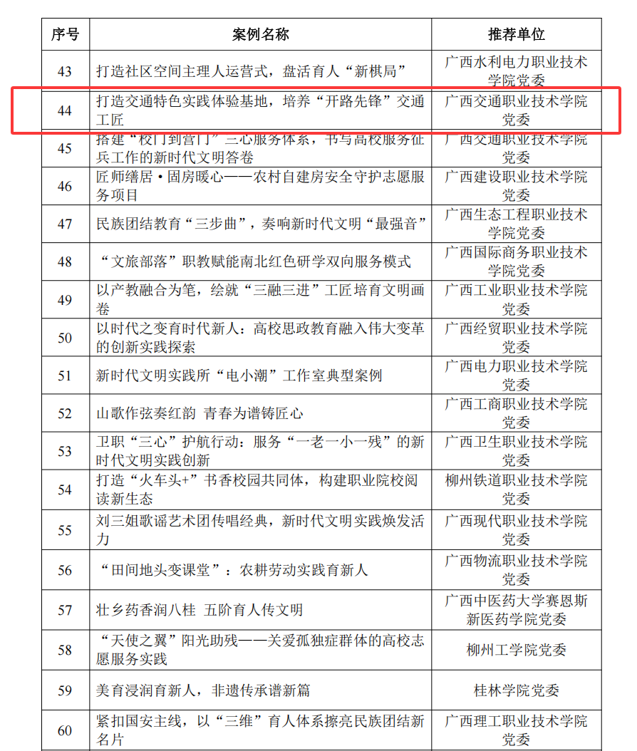(路桥讯)近日,自治区党委教育工委遴选出的80个新时代文明实践典型案例名单正式公布,我院《打造交通特色实践体验基地,培养“开路先锋”交通工匠》案例成功入选。