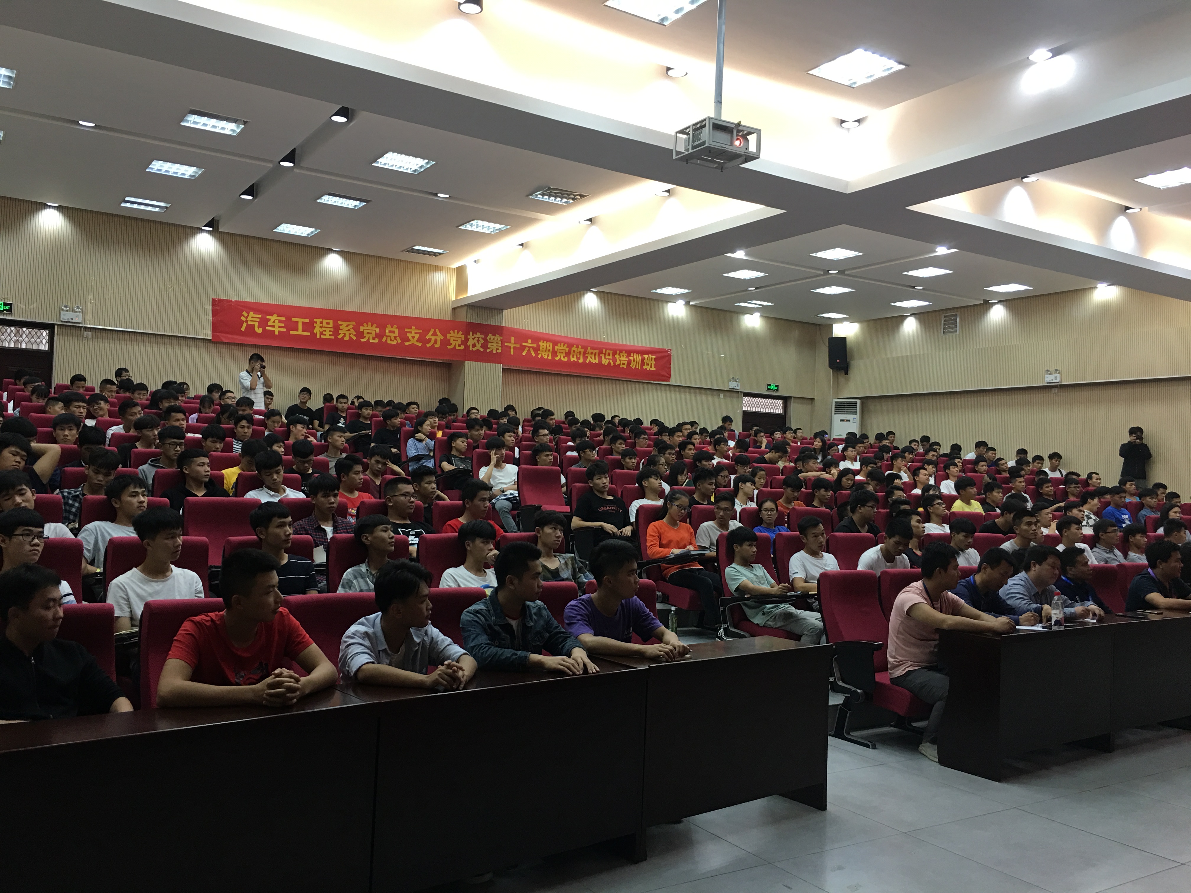 【汽车工程系讯 吴丹 梁海明/文、图】 11月6日下午,汽车工程系党总支第十六期党的知识培训班开班典礼暨第一次课在综合教学楼C2多功能厅隆重举行。系党总支全体委员、教工支部和学生支部全体委员以员和292名学生学员参加了开班典礼。