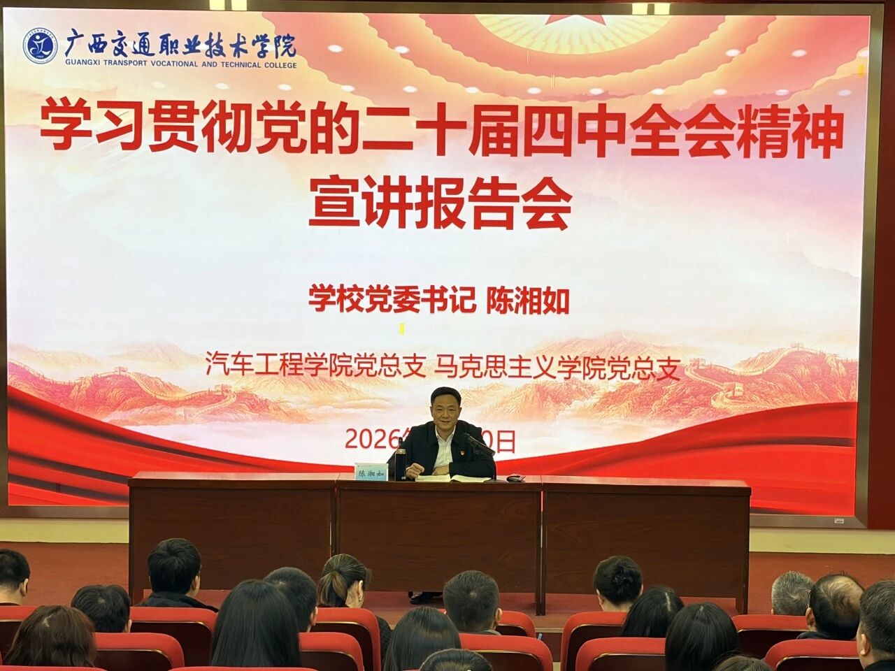 为深入学习贯彻党的二十届四中全会精神,有力推进学校“建国家双高 创职业本科”发展战略,有序谋划“十五五”发展规划,进一步统一思想、凝聚共识。2026年3月10日,学校党委书记陈湘如同志在昆仑校区第二报告厅作学习贯彻党的二十届四中全会精神专题宣讲报告。汽车工程学院、马克思主义学院全体教师聆听讲座。