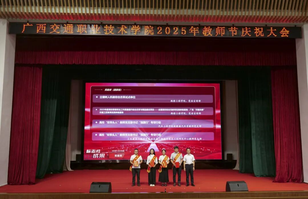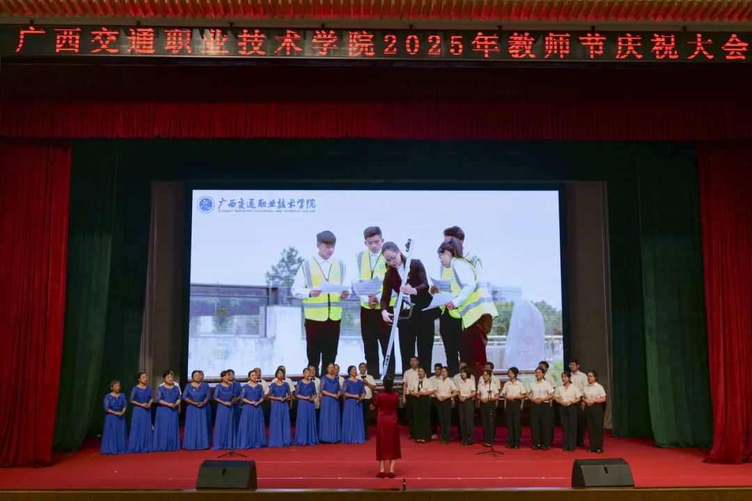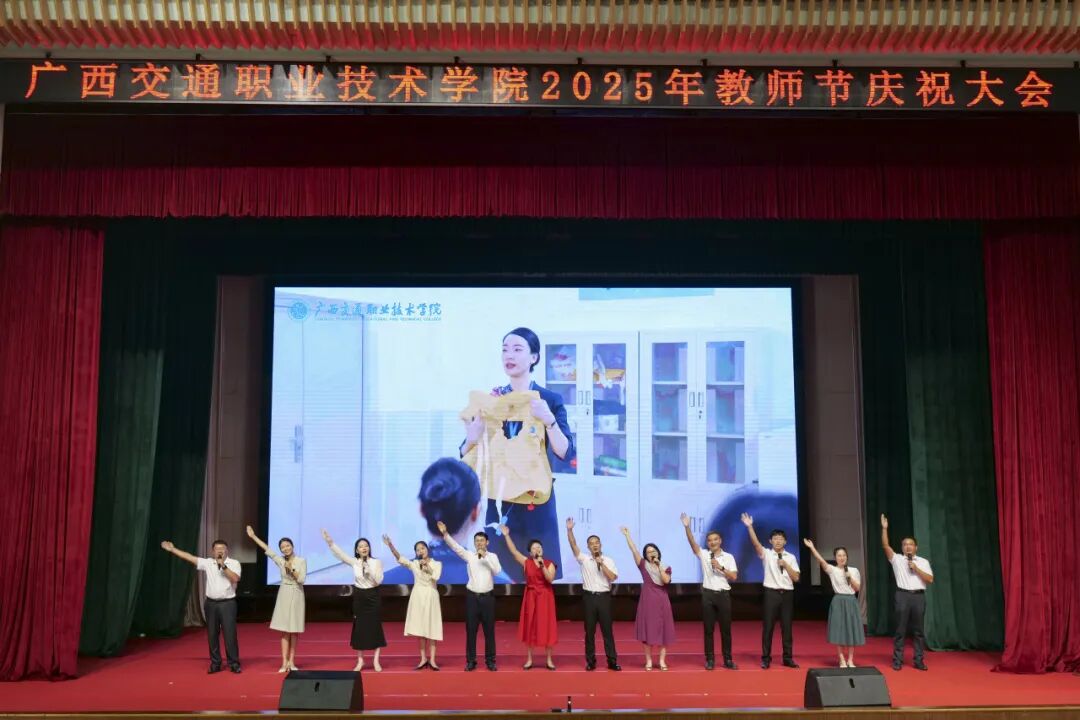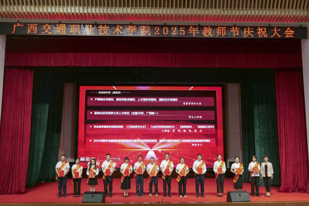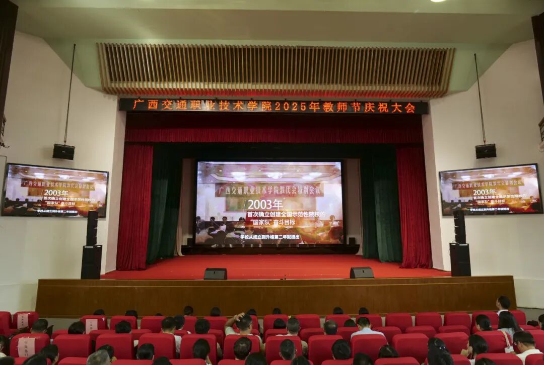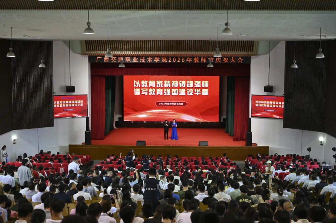 (党委办公室、宣传部 讯 )9月10日,学校在园湖校区大礼堂举行2025年教师节庆祝大会。自治区交通运输厅党组成员、副厅长陈津维,自治区交通运输厅科教处处长韦红教,学校党委书记陈湘如,党委副书记陈海峰,党委副书记、纪委书记麻新桃,副校长黄云奇、戴晓云、邱实出席庆祝大会,全校教职工参加大会。