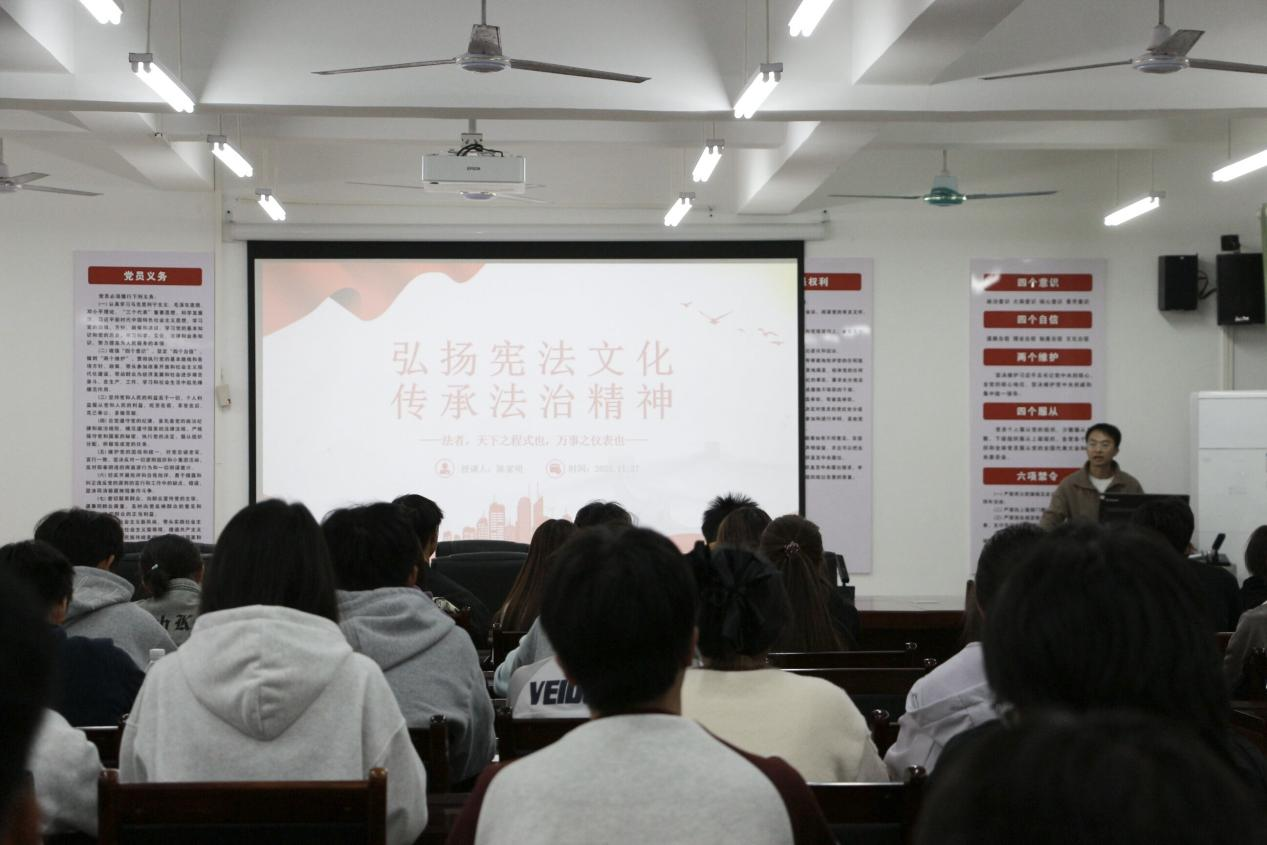 陈家明老师带来《弘扬宪法文化,传承法治精神》专题团课。他从宪法的重要地位出发,结合大学生日常学习生活场景,用通俗易懂的语言阐释法治精神的内涵,引导入团积极分子树立正确的权利义务观念,增强法治意识和法治素养,自觉成为宪法的忠实崇尚者、自觉遵守者和坚定捍卫者。