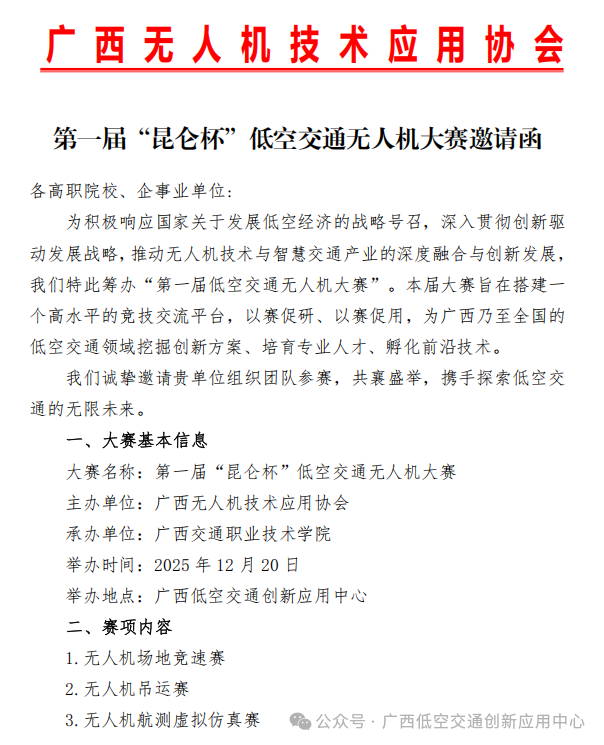 为积极响应国家关于发展低空经济的战略号召,深入贯彻创新驱动发展战略,推动无人机技术与智慧交通产业的深度融合与创新发展,我们特此筹办“第一届低空交通无人机大赛”。本届大赛旨在搭建一个高水平的竞技交流平台,以赛促研、以赛促用,为广西乃至全国的低空交通领域挖掘创新方案、培育专业人才、孵化前沿技术。我们诚挚邀请贵单位组织团队参赛,共襄盛举,携手探索低空交通的无限未来。