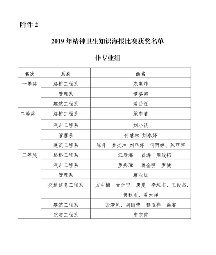 经组织专业教师评审,我系荣获多个活动荣誉。在精神卫生知识竞赛中,我系六名同学组成队伍获得二等奖;在知识海报比赛非专业组比赛中,我系一名同学获一等奖、五名同学获二等奖、四名同学获三等奖;在主题班会活动中我系建造2019-5班获二等奖、建筑2019-3班获三等奖。