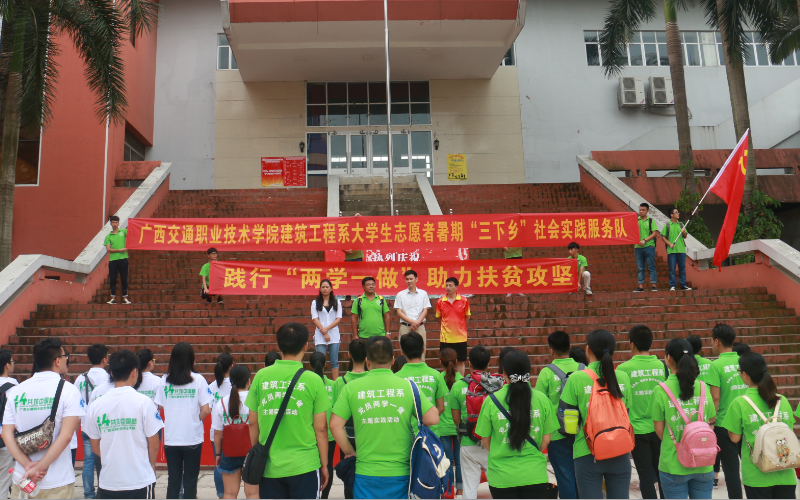 2016年7月11日8:20建筑工程系在园湖校区开展三下乡动员大会。韦红教副院长强调并指出“两学一做”助力扶贫攻坚的意义并提醒师生活动期间注意安全,希望师生能巧借平台在实践中长知识、增才干。最后,建筑工程系党总支副书记邱文成宣布出发!随社会实践队成员有序乘车前往广西河池市东兰县三弄瑶族乡。