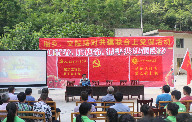 (建筑工程系讯 杨青/文)2016年7月13日,广西交通职业技术学院建筑工程系与东兰县三弄瑶族乡全洞村开展了“瑶乡、交院结对共建联合上党课”活动。广西交通职业技术学院建筑工程系党总支副书记邱文成、东兰县三弄瑶族乡党总支书记韦生全同志、村民代表蒙仁贵同志、乡老党员与交院全体党员师生参加了党课学习。驻村第一书记韦东耀同志主持活动。