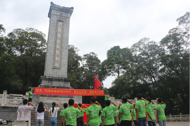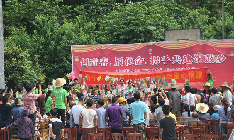 此外,社会实践队成员和当地村民还联合举办“创青春·履使命,携手共建铜鼓乡”文艺汇演。在汇演的同时,现场举办了南宁市桂雅璐小学2014级5班爱心书籍捐赠,南宁电台经典1049、北京麦乐家园农业科技有限责任公司爱心乐器捐赠与学院环保2013班、市政2013-1.2班、园林2013班爱心文具捐赠活动。15日,还组织师生参观了韦拔群纪念馆,缅怀革命先烈,重温入党誓词与入团誓词,进一步增强师生的爱党爱国爱校情怀。