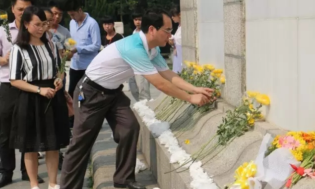 我系和航海系参加活动的所有成员庄严地在墓碑前集合。活动开始,全体成员立正,当国歌在墓碑前响起时,全体自觉肃立,口中随着伴奏唱国歌,在国歌的歌声落下后,建筑工程系主任谢军老师致辞并主持了本次活动的纪念仪式,全体参与人员默哀一分钟,并在烈士墓碑前低头鞠躬并默哀,寄托对烈士的哀思。在哀乐声中,大家用自己的方式表达对烈士们的敬仰与思念。随后全体人员将手中一朵朵饱含深情的小白花恭放在烈士们的墓碑前,以表深深的敬意!
