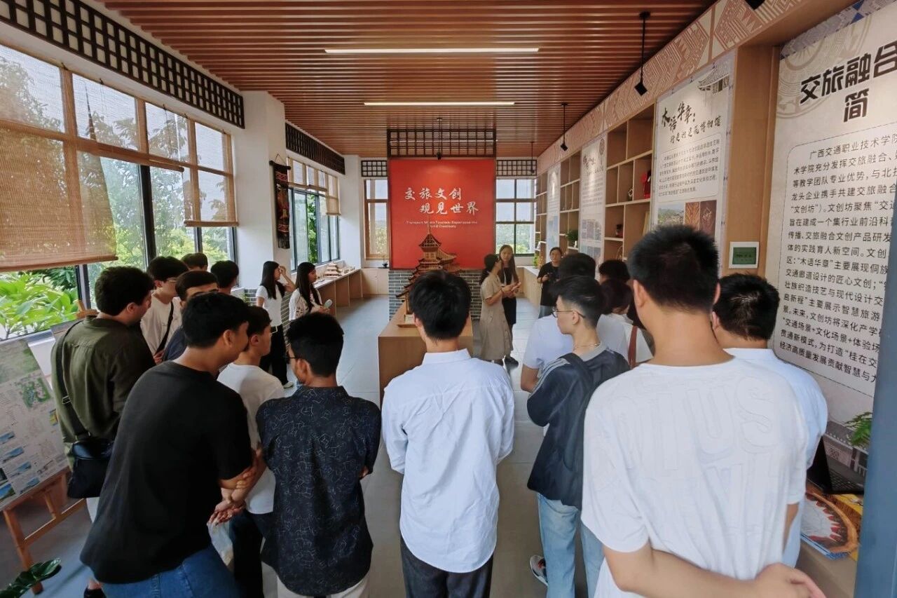 活动伊始,中外学子分组参观了交旅文创坊与广西基础设施三维数字孪生工程研究中心,在李晓童、梁承龙和彭来等专业教师的讲解下,学生们不仅欣赏了传统非遗文创作品的匠心之美,更通过数字孪生平台的动态演示,直观感受到智能建造、智慧工地与低空技术在现代工程中的创新应用。传统工艺与前沿科技在此交融,为非遗文化注入了新时代的活力。
