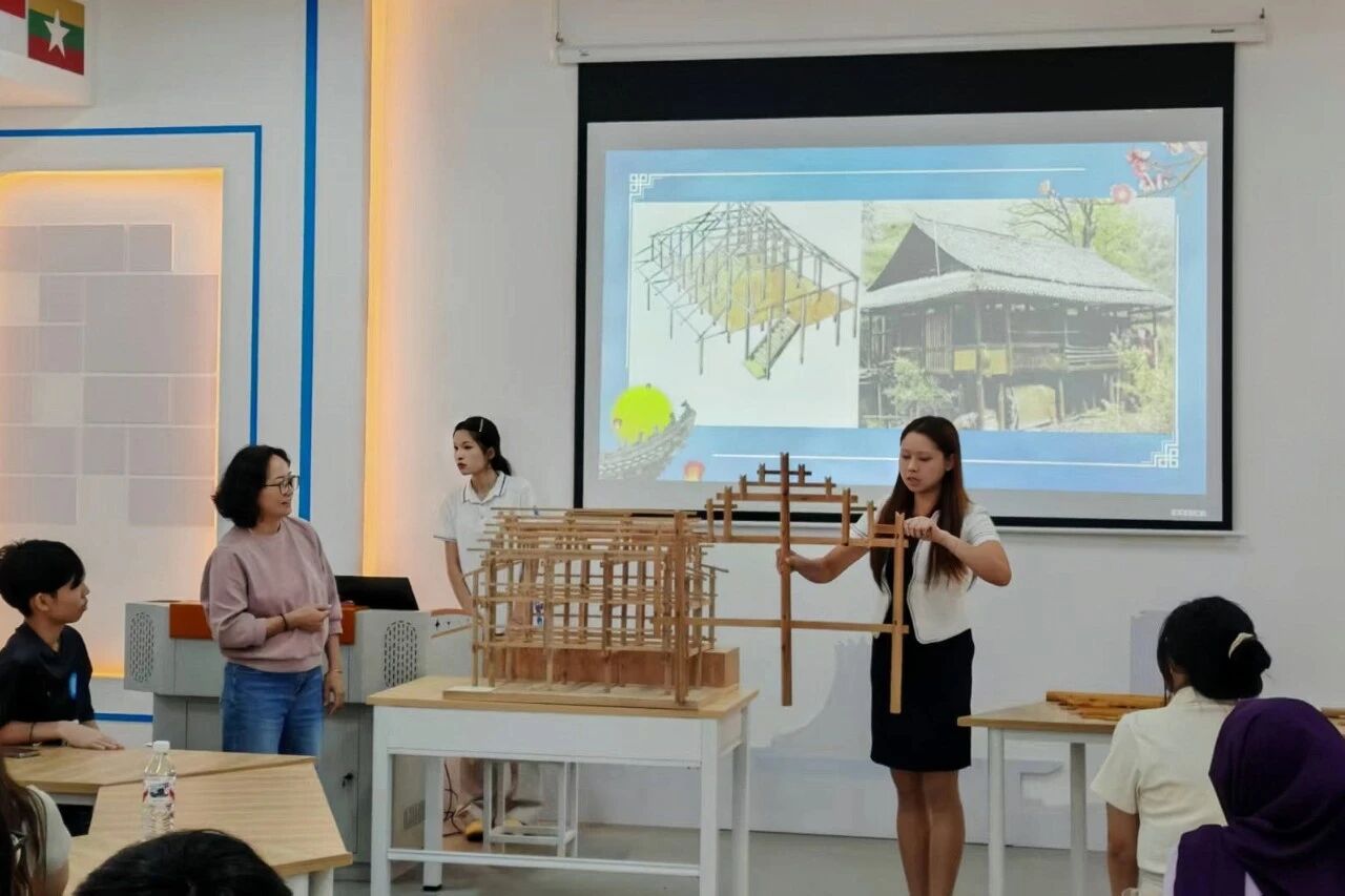 在国际学生文化交流基地,李晓童老师以侗族鼓楼为例,深入浅出地讲解中国传统木构建筑中的榫卯技艺。通过侗族鼓楼营造动画视频与实物模型展示,抽象的结构原理变得生动可感。并邀请中外学生分组协作,亲手尝试侗族木构“一品梁架”的拼接,在一拼一接间领略“不用一钉一铆”的营造智慧,现场互动热烈,惊叹声与欢笑声不绝于耳。