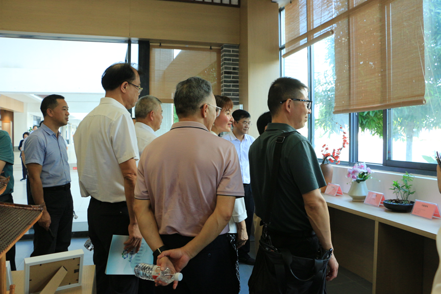 首先,观摩组一行参观了我院的交旅文创坊,该文创坊是学院主动适应交通与旅游融合发展的新趋势,携手广西旅发科技股份有限公司等企业共同打造的集行业科普、非遗体验与文创研发于一体的实践育人空间。在文创坊,由我院交旅融合智慧园林教学团队指导学生完成的“梅、兰、竹、菊”廉洁主题花艺作品令与会代表们印象深刻。他们对专业教学团队将日常技能训练与廉洁文化浸润有机结合,引导学生“树清廉之心、行清廉之事、做清廉之人”的做法表示赞许。现场陈列的廉洁主题壮锦纹样的布袋、清廉公约书签等文创作品也吸引了众多代表驻足流连。