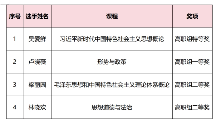 (马克思主义学院 讯 邓锐、吴爱鲜/文)近日,自治区教育厅公布了2025年全区高校思政课教师教学基本功比赛获奖名单。我校收获高职高专组1个特等奖、1个一等奖,2个二等奖的好成绩。全区高校思政课教师教学基本功比赛是广西高校思政课教师每年进行教学研讨和教学展示的重要平台,本次比赛自今年8月份启动以来,全区共有249位思想政治理论课教师参赛,经初赛遴选、专家评审等环节,最终有33位教师入围现场决赛。决赛中,我校马克...