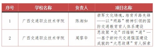 (党委宣传部 讯 兰东宇/文)2个项目入选全区高校思想政治工作改革创新经验推广项目,6个作品入选第十一届全区大学生网络文化节和全区高校网络教育优秀作品展示大赛,3个项目获全区高校大学生讲“壮美广西・大思政课”比赛表彰……近日,自治区多项思政项目及网络文化赛事评选结果陆续公布,我校以丰硕的思政成果在多个领域捷报频传,这份亮眼成绩单,是学校将思想政治教育与交通技术技能培养深度融合、深化教育教学改革取得的...