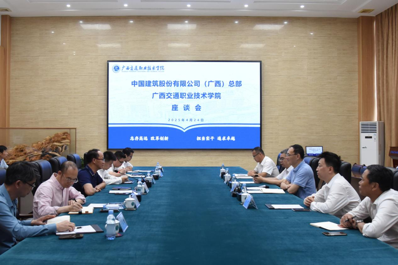座谈交流中,李文勇校长对中国建筑股份有限公司(广西)总部领导的到来表示热烈欢迎,并简要介绍了学校的基本情况、办学特色以及近年来在教育教学、科研创新等方面取得的成绩。中国建筑股份有限公司(广西)总部董事长刘延峰介绍了公司基本情况与此行调研的目的。双方就产教融合共同体建设、人工智能和低空经济技术研发与创新合作事宜进行沟通交流,达成进一步合作的共识。